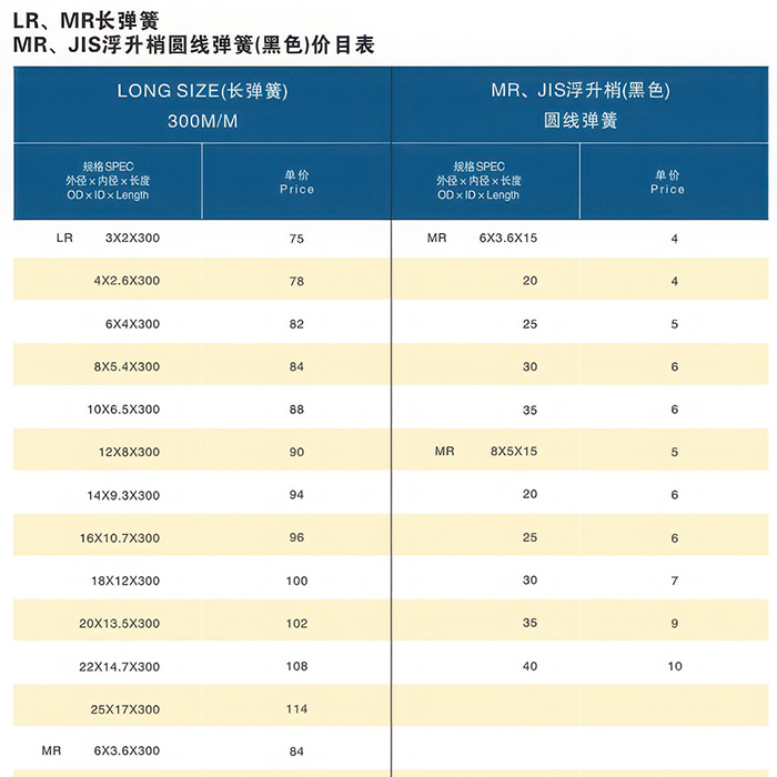 Прайс-лист на легкие и малые пружины TF